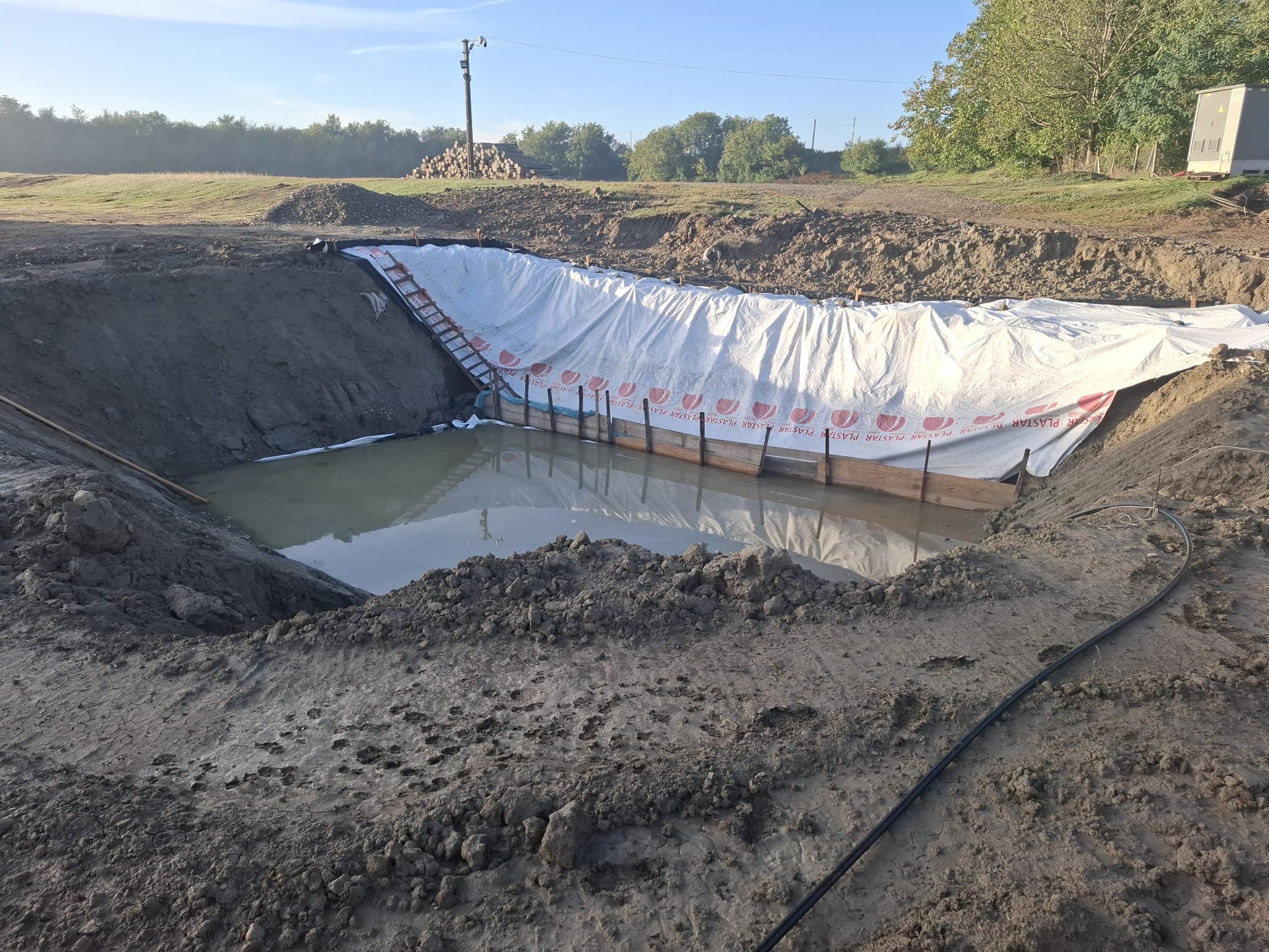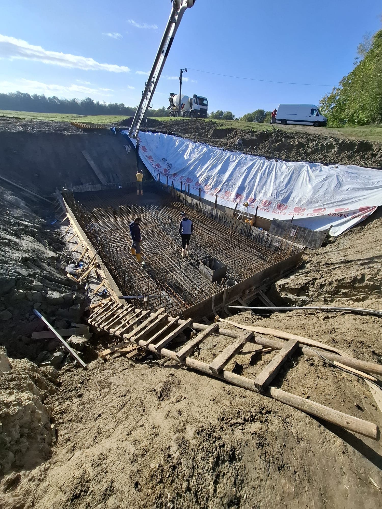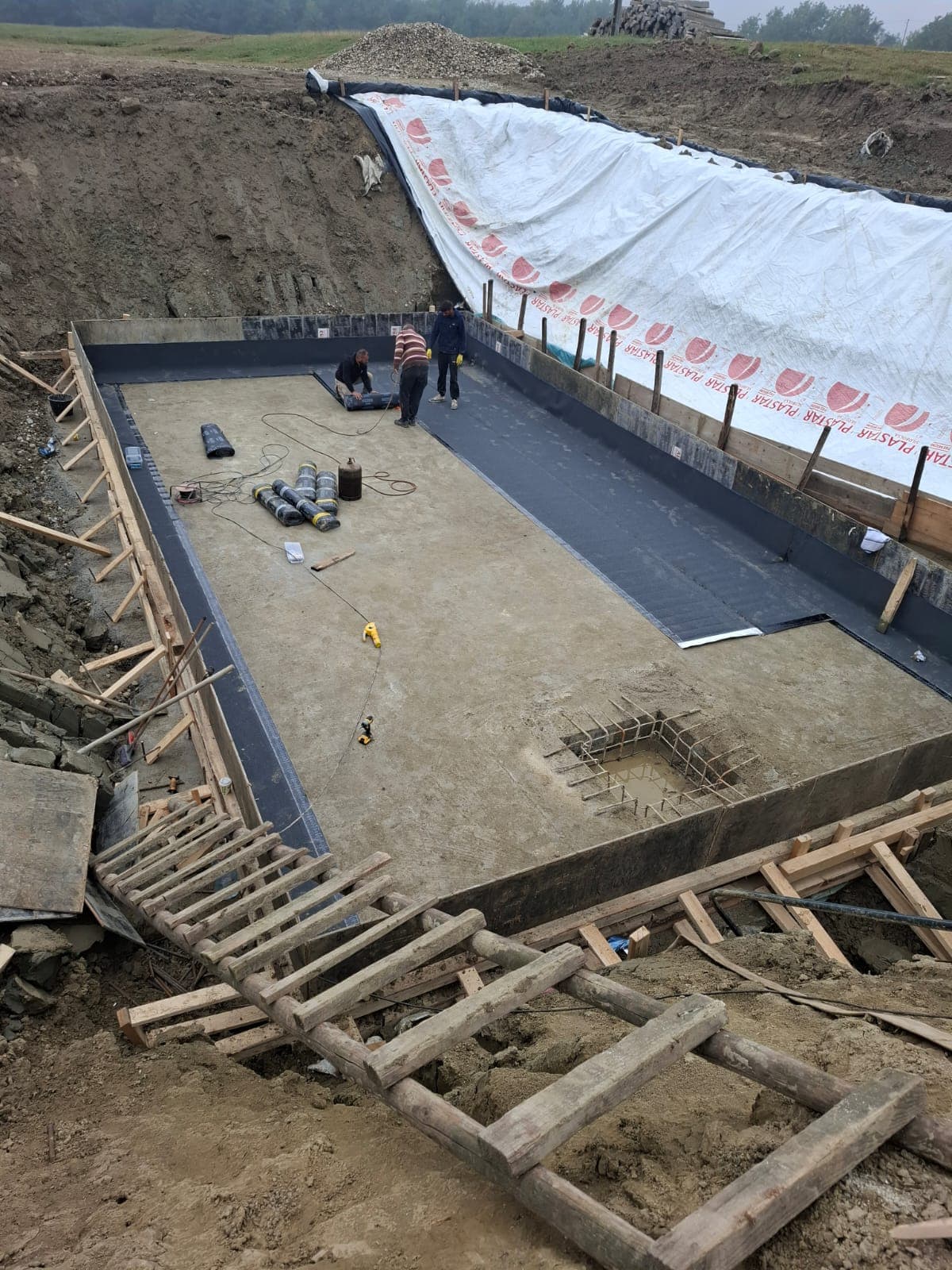Pe fundul excavației s-a turnat un strat de beton de egalizare, urmat de aplicarea unui sistem de hidroizolație bituminoasă cu ardezie.